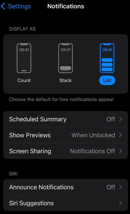 On your Apple device (with the iOS version 17 or higher) in the menu "Settings" then "Notifications" you can generally define, how and when notifications are displayed on your device: