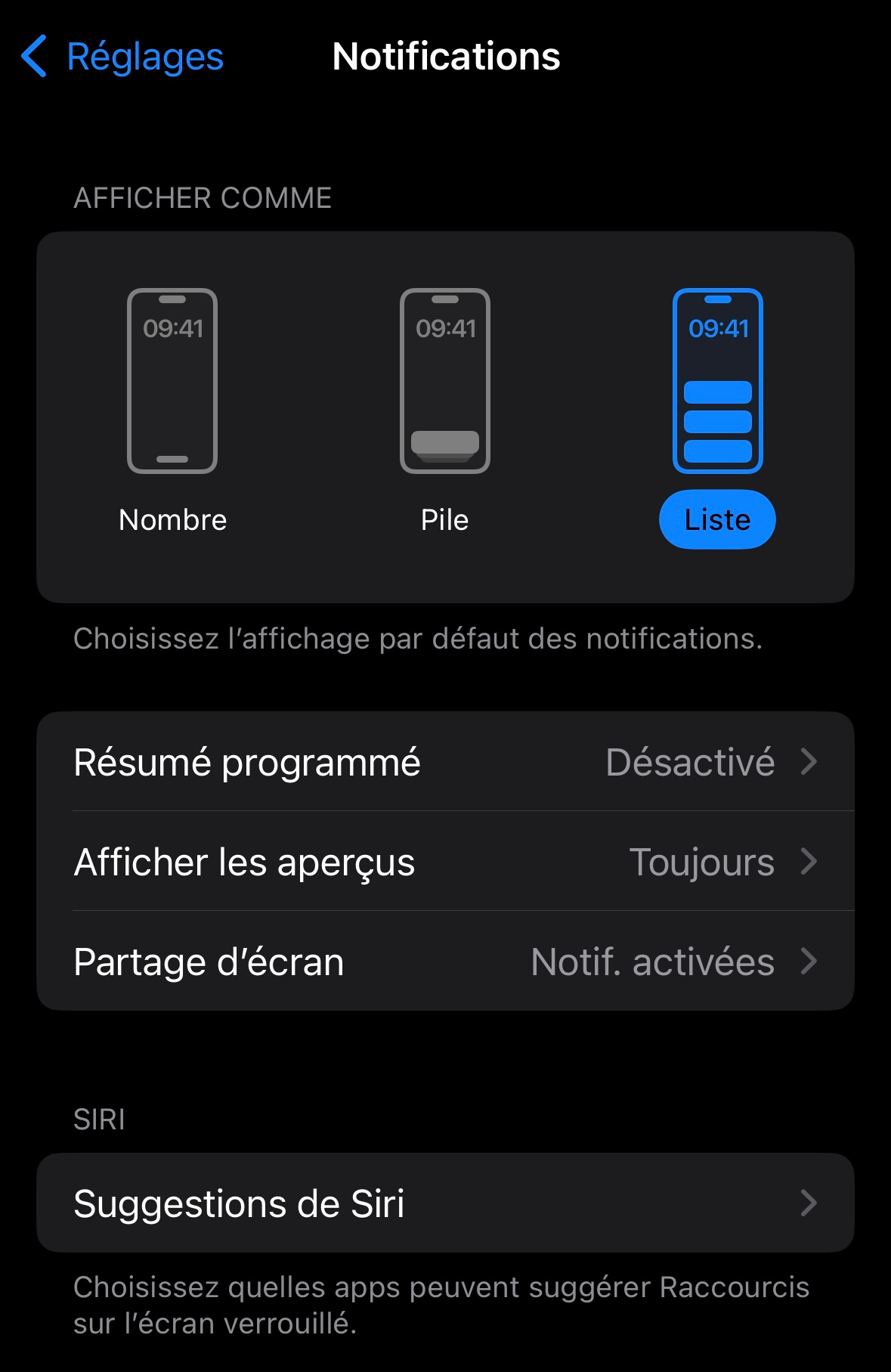 Sur votre appareil Apple (avec la version iOS 17 ou supérieure), dans le menu "Réglages" puis "Notifications", vous pouvez généralement définir comment et quand les notifications s'affichent sur votre appareil :