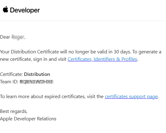 Si l'on reçoit cet e-mail de la part d'Apple, on peut l'ignorer, car sureVIVE s'en charge automatiquement en arrière-plan. La seule raison pour laquelle on reçoit ce mail est que l'on est le propriétaire du compte Apple Developer.